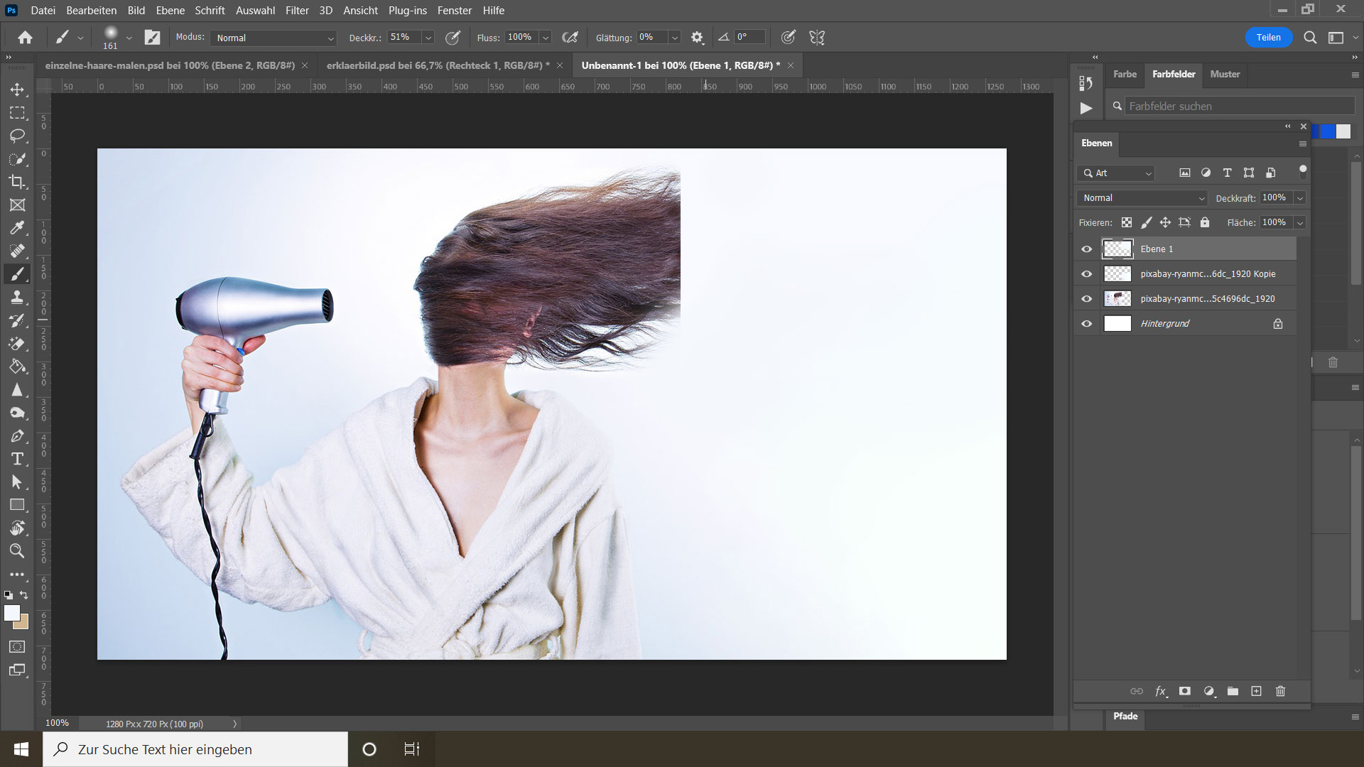 Haare komplett selbst zu malen ist wohl am zeitaufwendigsten, doch das Endergebnis lohnt sich. Du kannst nur sparsame Details aus einzelnen Haaren kreieren oder komplette Strähnen und Haarverlängerungen hinzufügen. Der fertige Freisteller eignet sich anschließend für alle Arten von Foto-Montagen.