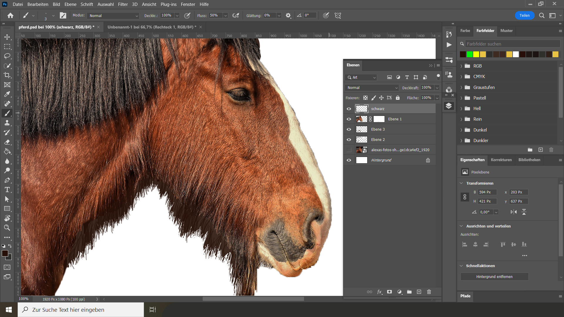 Objekt direkt nach dem Freistellen. Die braune Mähne konnte nicht mit freigestellt werden, weil sie mit der braunen Hintergrundfarbe verschmolzen war.