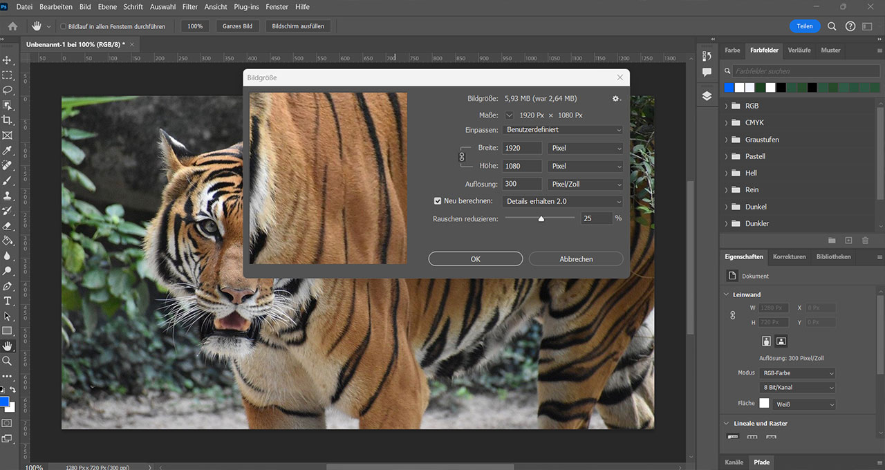 Öffne das Bild in Photoshop und klicke im Reiter „Bild“ auf „Bildgröße“. Hier änderst du die Auflösung auf 300, wenn du das Foto für den Druck vergrößern willst. Wenn du das Bild für Web vergrößern möchtest, kannst du die Auflösung so belassen, wie sie eingestellt ist (wahrscheinlich auf 72). Die Pixel- oder Zentimetergröße kannst du auf die gewünschte Größe ändern. Aktiviere das Kontrollkästchen „Neu berechnen“, wenn es nicht bereits aktiviert ist. Klicke auf das Dropdown-Menü und wähle „Details behalten 2.0„. Entferne das entstandene Rauschen nach deinem Belieben, empfohlen wird ein Wert um 25%. Bestätige deine Einstellung mit „OK“. Photoshop wird nun dein Bild vergrößern.